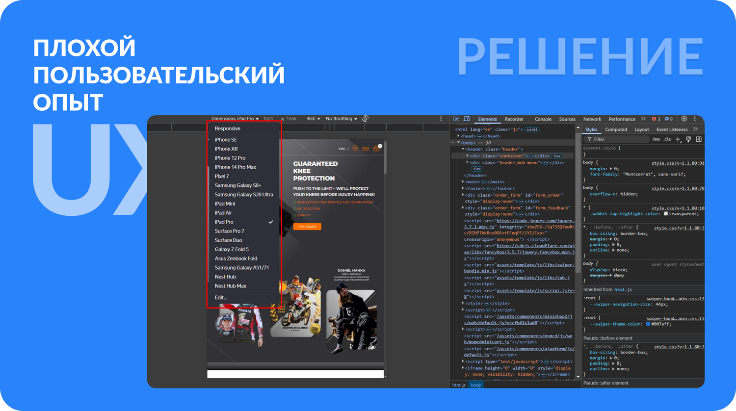 Для проверки адаптива вы можете использовать волшебную клавишу F12, которая направит вас в панель разработчика, где и можно проверить ваш сайт на наличие адаптива под разные устройства. Но не стоит просить исполнителей сделать сайт адаптированным под всевозможные устройства — лучше определить около 10 сверху, чтобы ваша душа была спокойна.